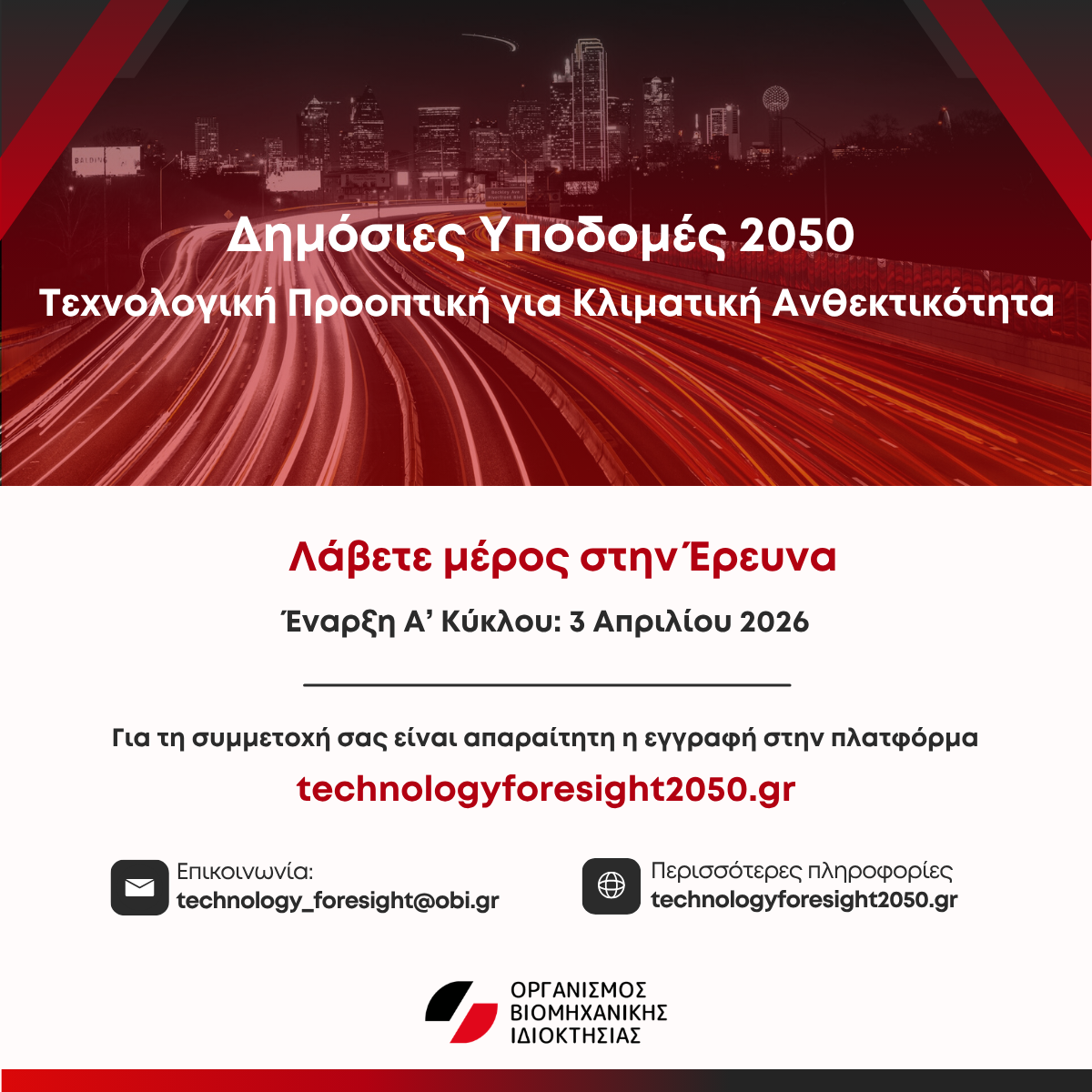 Ο ΟΒΙ καλεί όλες/-ους όσες/-οι ενδιαφέρονται να λάβουν μέρος στην Άσκηση, να κάνουν την εγγραφή τους στη σχετική πλατφόρμα: technologyforesight2050.gr