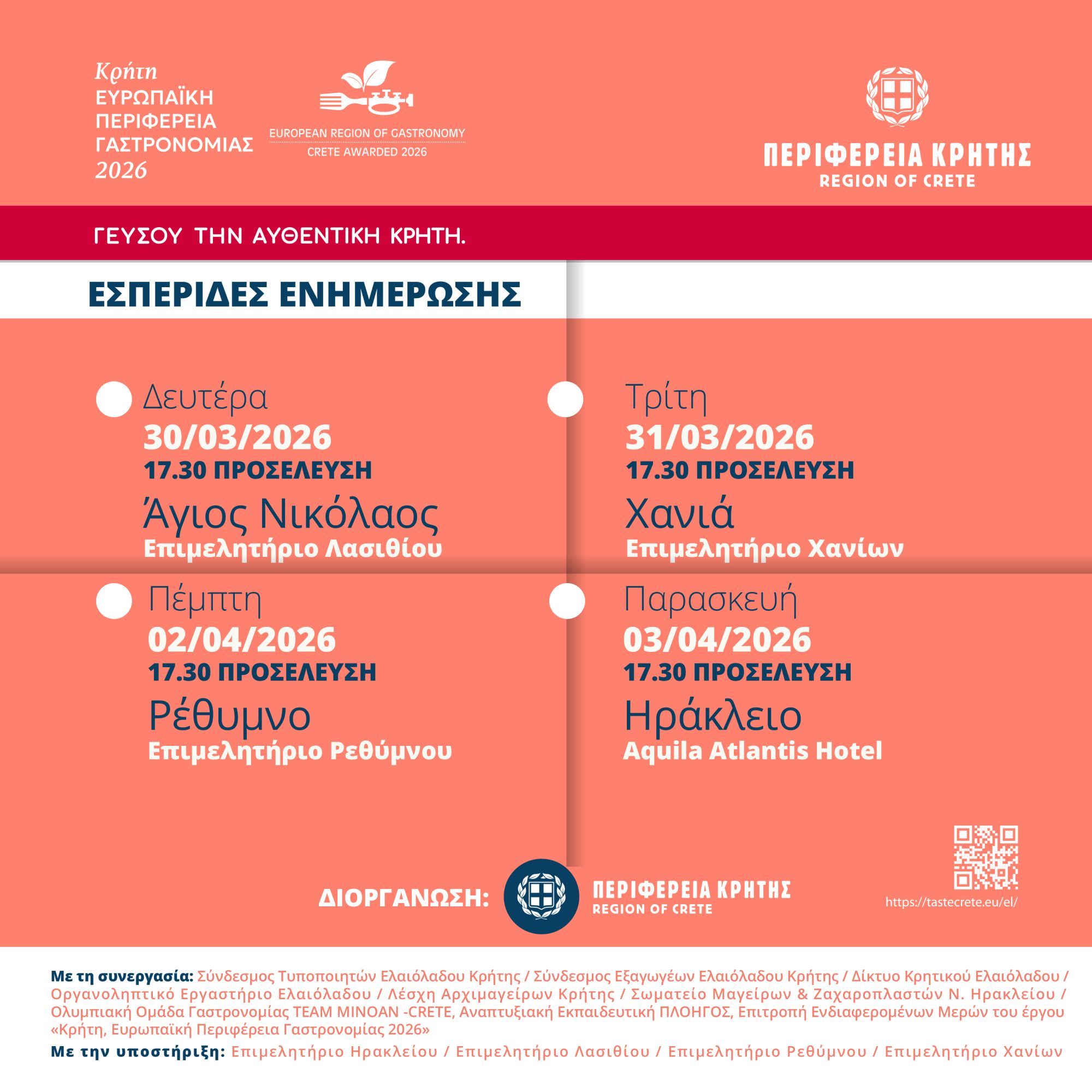 ΕΚΔΗΛΩΣΗ ΤΗΣ ΠΕΡΙΦΕΡΕΙΑΣ ΚΡΗΤΗΣ ΜΕ ΘΕΜΑ «ΚΡΗΤΗ, ΓΑΣΤΡΟΝΟΜΙΚΗ ΠΕΡΙΦΕΡΕΙΑ ΤΗΣ ΕΥΡΩΠΗΣ 2026» ΣΤΟ ΡΕΘΥΜΝΟ: ΠΕΜΠΤΗ, 2 ΑΠΡΙΛΙΟΥ- 17:30
